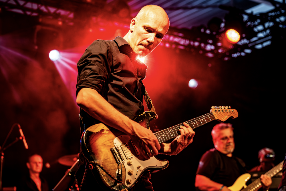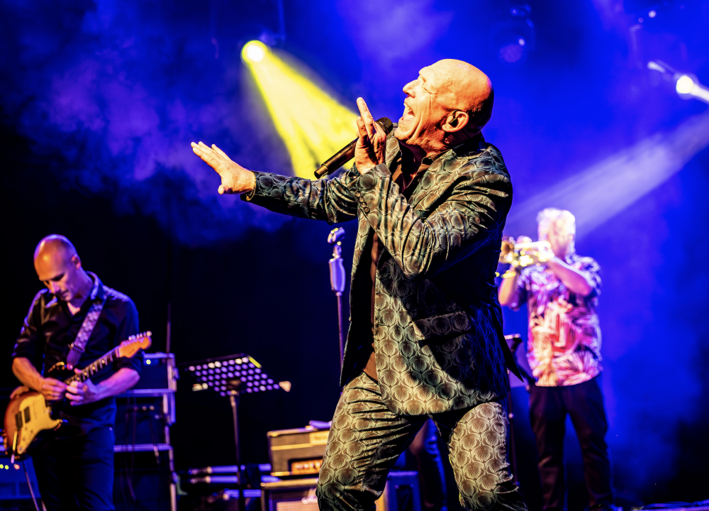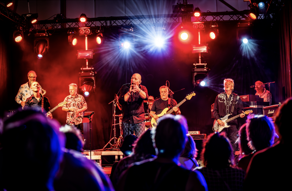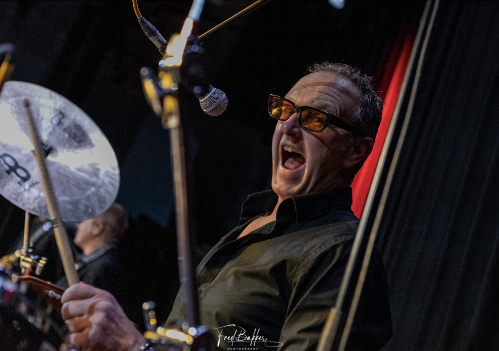 Zijn 7-koppige band ondersteunt hem vakkundig. Vriendelijk als het kan, stevig als het moet.