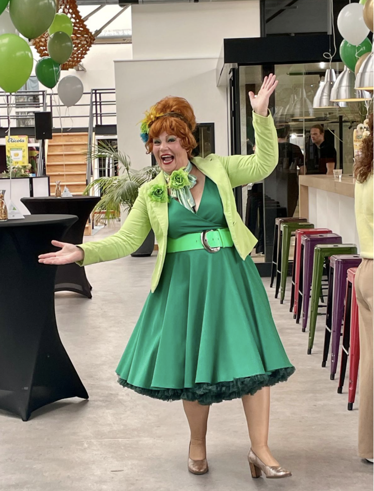 Gastvrouw Nancy ontvangst de gasten op een ludieke manier.